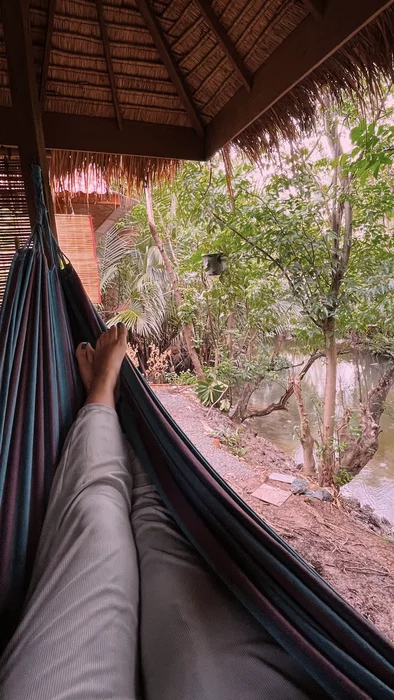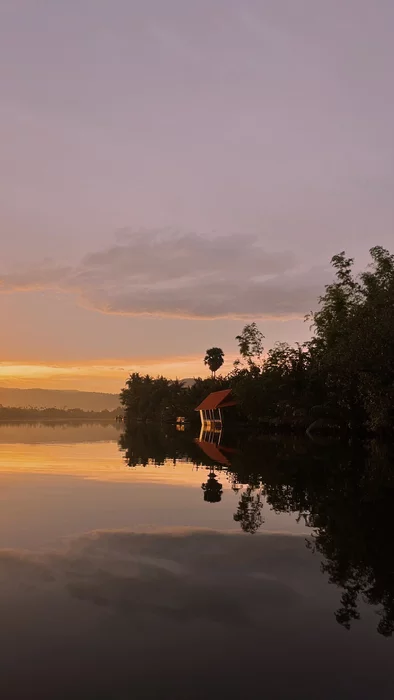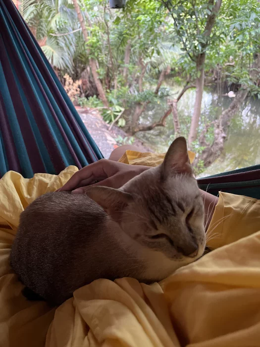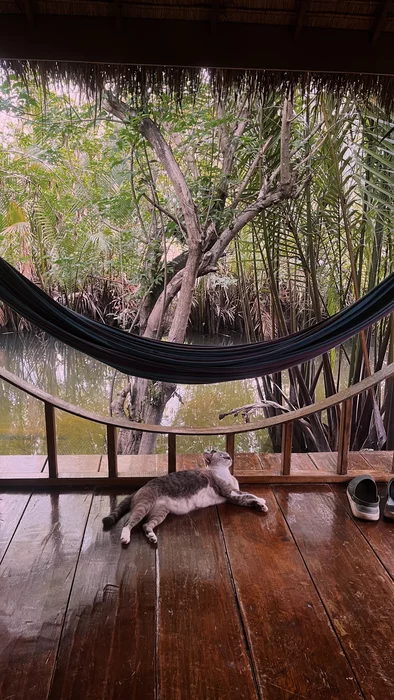 На следующий день нам предстояло переехать в новую гостиницу. Здесь у нас вновь было бунгало (такое же темное и привлекающее комаров), но на веранде ждал уже более прочный гамак. А самое главное, что эта веранда выходила на реку с мангровыми зарослями. Вишенкой на этом торте была местная кошка, с радостью принимавшая ласку и общение. Она даже чиллила с нами в гамаке и немного погостила в домике.