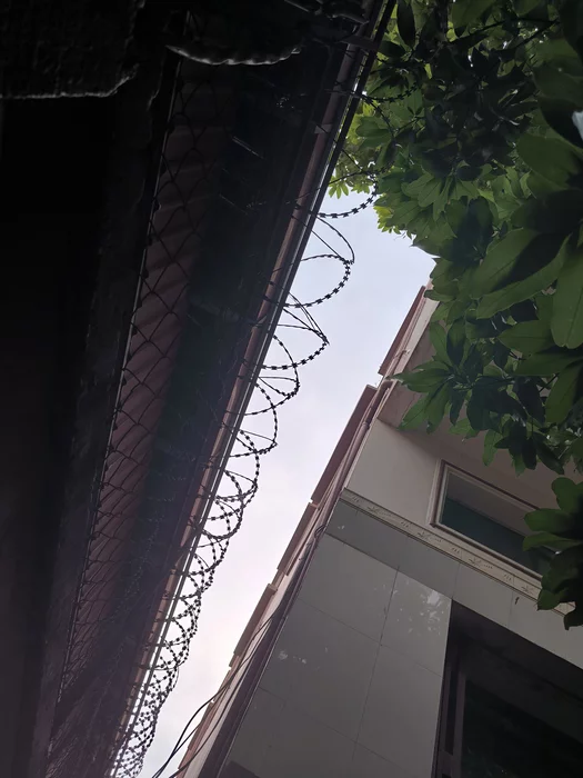 Правда, интерьер этого отеля очень сильно контрастировал с окружением. Во-первых, наш балкон выходил на 3 стены соседних зданий. Они образовали эдакий колодец, у которого по всем сторонам была намотана колючая проволока. Прям такая, которой оборачивают заводы и военные части, с крупными плоскими зубцами.