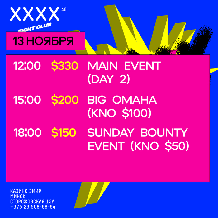 Самый интересный турнир начнется в 15:00 — $200 BIG Omaha (KNO $100). Ну а вечером на закуску $150 Sunday bounty event (KNO $50), с 20-минутными уровнями.