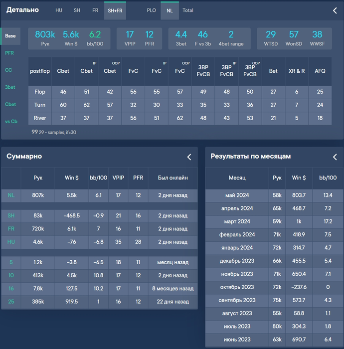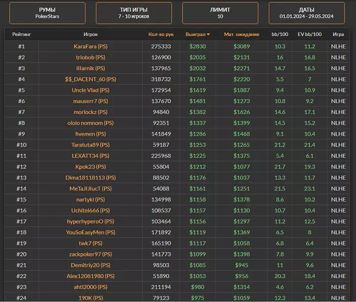 Были бы уникумы с высокими ввсф, которые типа эксплоитят слабую поляну говнорегов, давят в каждый их лик и тд и тп - еще бы усомнился, что такой игрок действительно селектит, а не прыгает за любой стол, но тут все видно. И конечно я не осуждаю этот топ, это наоборот правильно, селект самое важно и даже на нл10. Никакого винрейт с сухарями за столами у нас не будет.