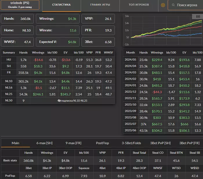 Он, может потерял какой-то сильноплюсовый отрезок, но 174к рук имеет для нл10. Не сказать, что винрейт близко к бамхантящим топ-регам, которые 10+ показывают на фр старзов на б'ольших дистанциях. Т.е. селект может решать некоторые моменты.
