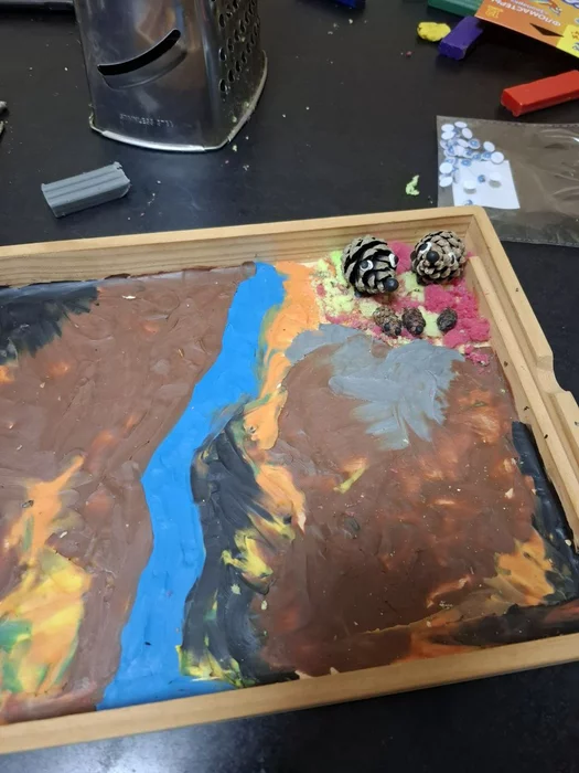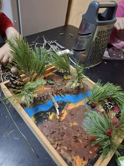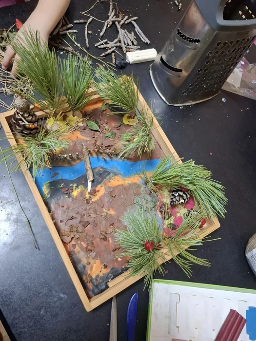 Это осенняя поделка. Вместе собирали материалы, обмазывали пластилином, создавали композицию.
