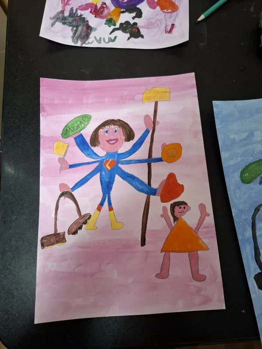 А это рисунок на тему Мама – Супергерой. Полина рисовала сама.