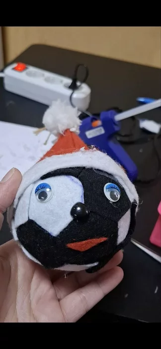 А это поделка на футбольную тему для конкурсной елки, которая стояла на одной из центральных площадей. Совместное творчество.