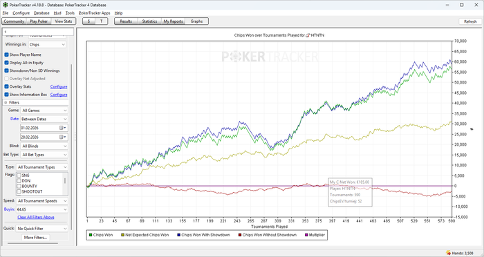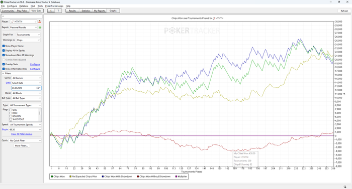 Думаю в долгую смогу исправить результаты, но пока тяжко даются десятки. Плюс ко всему, недобираю еще 700 евро по кассе относительно чипа. Хотя бы это не критично, учитывая то, что скоро расчеты пула. Из хороших новостей, сыграл еще билет за 25 евро в сателитке, в которой поймал какой то нереальный год мод. Уже минут через 30 после начала игры имел 12 стартовых, после чего спокойно досидел до прохода. Целевое событие 1 марта - турнир за 200 евро.