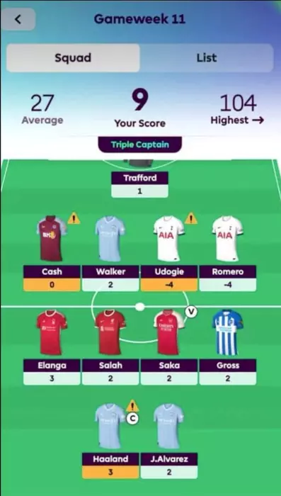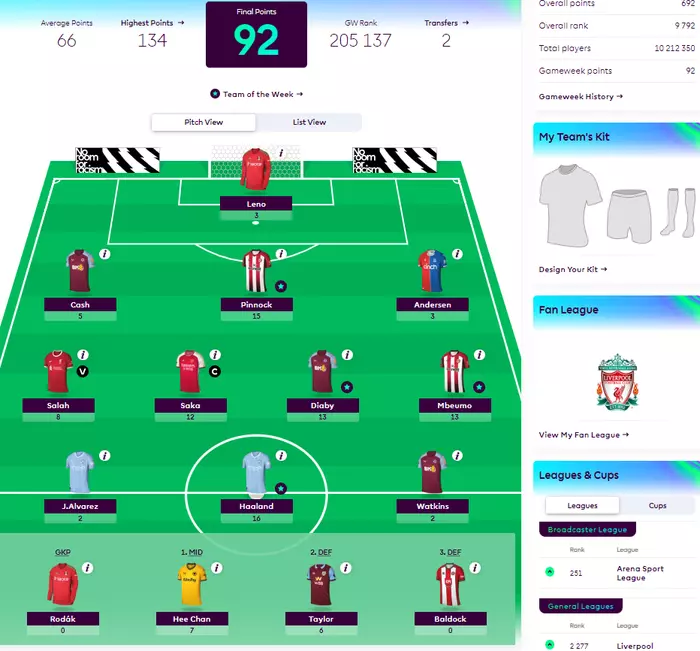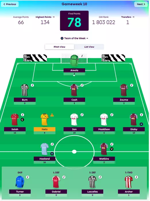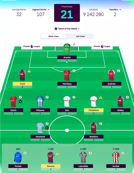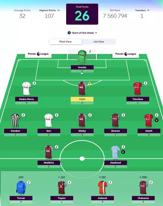 По капитану, этот тур интересен тем, что были возможны 4 варианта капитана: Салах, Холланд, Вотинс и Сака. И для меня Сака стоял на 4 месте, несмотря на матч с Шеффилдом. Дело в том, что Сака некоторое время играет с травмой и сейчас не в лучшей форме, я был уверен, что он не сыграет весь матч. Более того, были мнения, что он может вообще не выйти в старте с Шеффилдом. Последние пару матчей он провел неудачно, особенно матч ЛЧ с Севильей. Поэтому я отказался от первоначального плана и даже не стал его покупать и продавать Сона, и оказался прав.