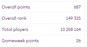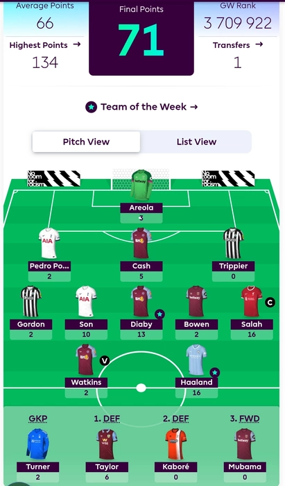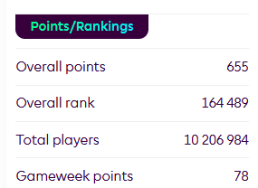Средненький геймвик, но главное, что не стал капитанить Воткинса, был бы совсем провал. А так зелёная стрелка, но до топ-100к пока не дотянулся. План на ближайшие 2 тура - разменять Триппьера на Сака, скорее всего через Диаби, хоть он и занёс в этом туре. Но продавать Сона не хочу, а по-другому не получается)