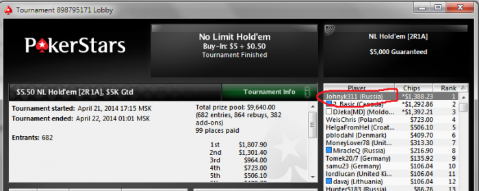 Вчера было два запоротых дипа, но радует тот факт, что запоролись они не по моей вине) Cначала вылетел 15-ым в 5.5 2р1а за 2 раздачи: