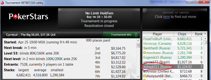 Сделал аж 11 итм за 29 туров (кстати, догадайтесь, почему я отыграл 29, а не 30 туров как обычно. Из подсказок могу лишь сказать, что играю фризы 5-22$, поля от 500 и до бесконечности + держу 12 столов и если нужно подгружать 13-ый, то жду вылета из какого-нибудь идущего тура и только потом ныряю в позднюю регу след. турнира. Кто правильно ответит - получит +100 к репе за сообразительность)!