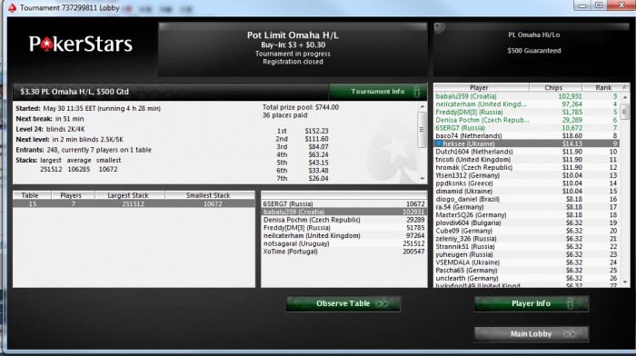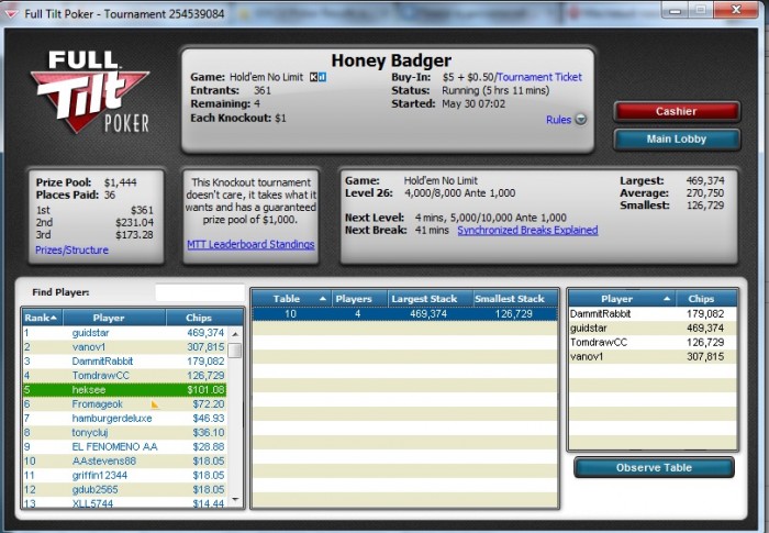 Full Tilt, 20/40 blinds No Limit Hold'em Tournament, 9 Players