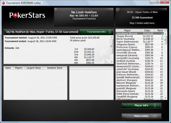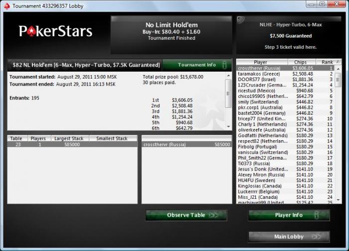 1) Француз помучавшись минут 7 на ривере выкинул АА на доске 98383(я давал рейз флопа и бет тёрн и ривер), хотя вышедшие повторы 8ки и 3ки должны практически аннулировать наличие у меня сета(у меня-то есно были 99, но французы не должны в это верить по идее...)