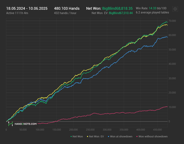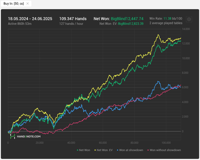 Если поставить фильтр бай ин $60+, убрать турниры по $55, то винрейт сразу падает до 7.3бб/100, а профита почти не остается. Правда и аби возрастает до $132.