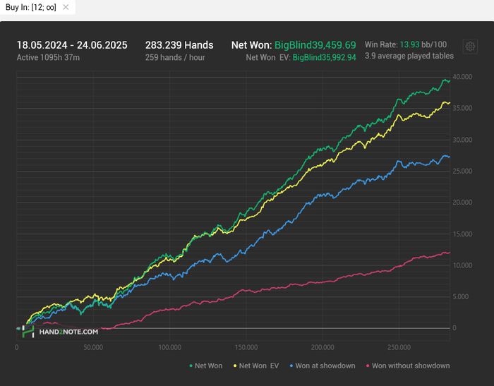 Винрейт вышел 12.8бб/100. Все таки хотелось бы 14бб/100 как в прошлом году, будем работать над этим.