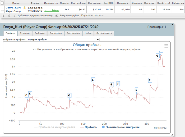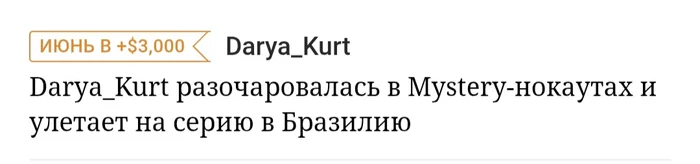 В июле проходили 2 мистери серии на пс.ком и пс.ес, которые я плотно откатала. Я никогда не была фанатом мистери, мне всегда казалось, что нет смысла надеется на топ нок, так как процент этого ничтожен, возможно поэтому никогда не привлекали слоты и так далее. Так вот, отфильтровала турниры мистери в шарке и обнаружила, что катаю их примерно в ноль (на графике не учитан нок $3500 на ес).