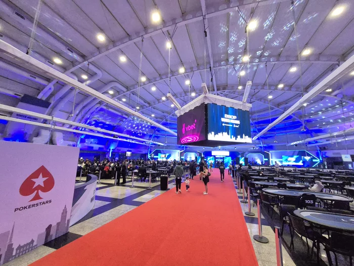 Играю недорогой турнир за $280, ко концу первого перерыва было уже 500+ входов, а на фото только 1/4 большого зала, а есть еще один маленький. Посл фото сделала в 14:10, сама серия началась в 14 часа, так что не обращайте внимания на пустые столы.
