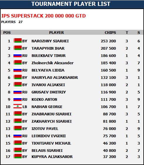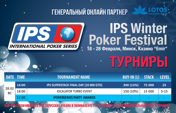 Cтарт IPS Superstack Day 2 завтра в 14:00. Поздняя регистрация продолжится в течении 4 уровней, игра начнется с блайндов 1 000/2 000, анте 200. Напоминаем, что турнир с оверлеем! BI $300, гарантия 200 000 000 BYR (~10 000)