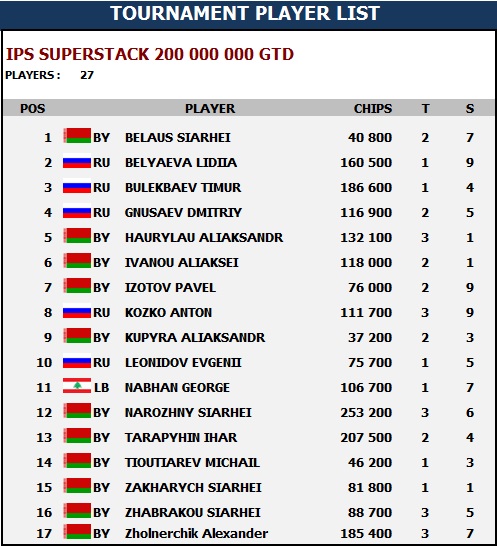 Начался IPS Superstack Day 2. BI $300, гарантия 200 000 000 BYR (~10 000) Блайнды 1к/2к, анте 200. Средний стек - около 109 000 У нас 32 входа, в игре сейчас 22 человека.