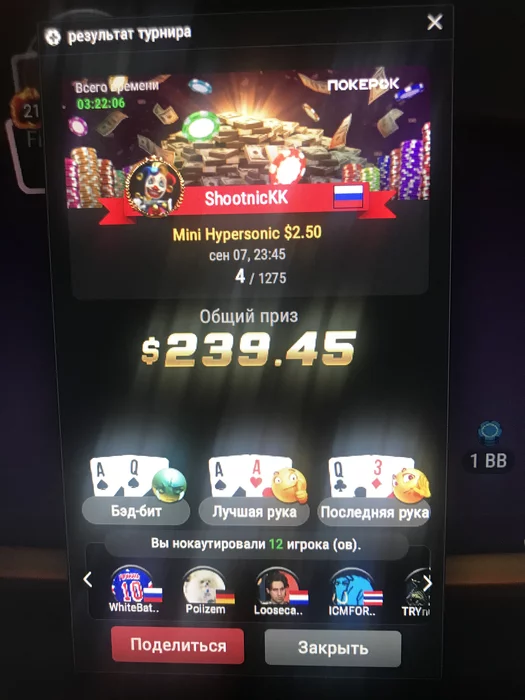 Shootnick88, я так как-то на восьмерых делил в гипер-турбине....долгая предфиналка, на финалку вышли со средним стеком в 12бб, максимальным типа 18 - к чему гонять эту диспу за дорого)