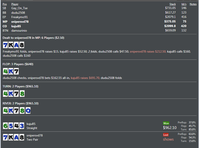 Odd_Oddsen, Ясно, наверно даже надо больше смотреть не сколько они защищают блайнды, а сколько защищают именно 3бетом. В твоей раздаче у 2zeros на BTN по логике не было смысла в плоском рирейзе 520$ с его стеком, он и спалился что нет тузов и потерял преимущество позиции. Если бы он сыграл полным перебанком, тебе бы пришлось либо сразу играть в рулетку, либо смотреть флоп и проигрывать. Соответственно 2zeros сыграл плохо и проиграл 1,5к$ заслуженно. Аналогичная раздача, мне бы твой красивый флоп, я бы тоже kaju85 наказал
