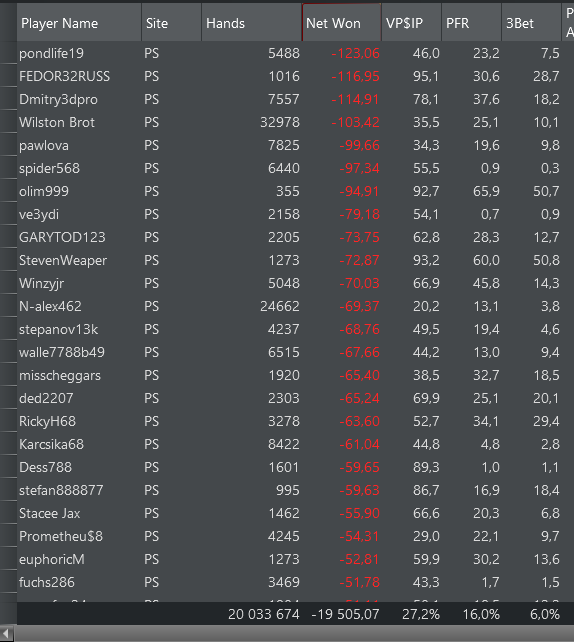 А если брать по залетным фишами, на которых мало рук, то есть такие, что за свои 100 рук слили около 400$;) но это разумеется лимит не нл2;) Но все равно приятно удивляет...)
