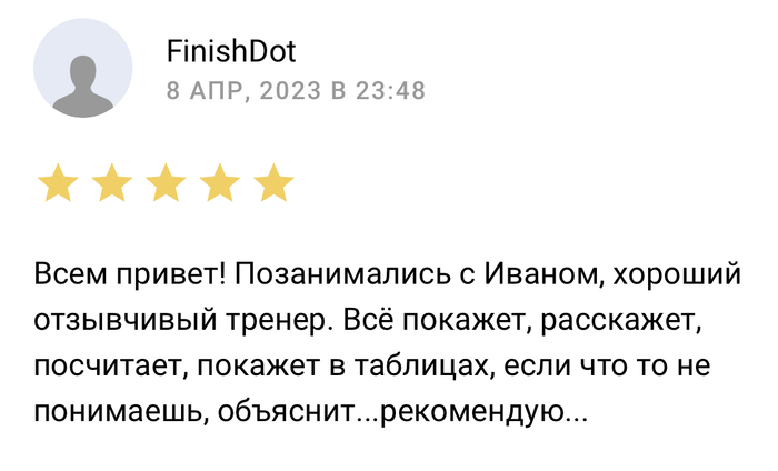 Недавно закончил 5 тренировок с Иваном, Все понравилось, советую. Очень информативно.