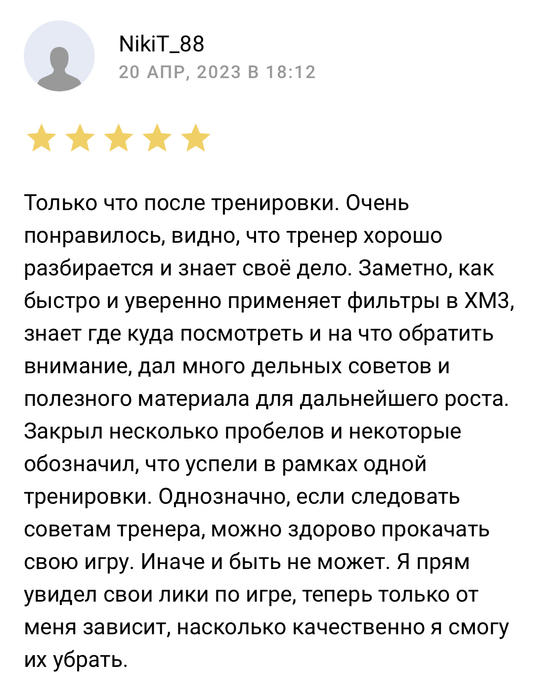 Всех приветствую! Взял курс на 5 занятий у Ивана и не пожалел от слова совсем! Очень хороший тренер с хорошим бэграундом знаний! Много чего нового открыл для себя и хочу порекомендовать для начинающих игроков! Буду обращаться еще и всем рекомендую!!! 5+