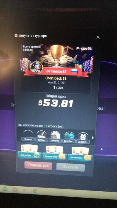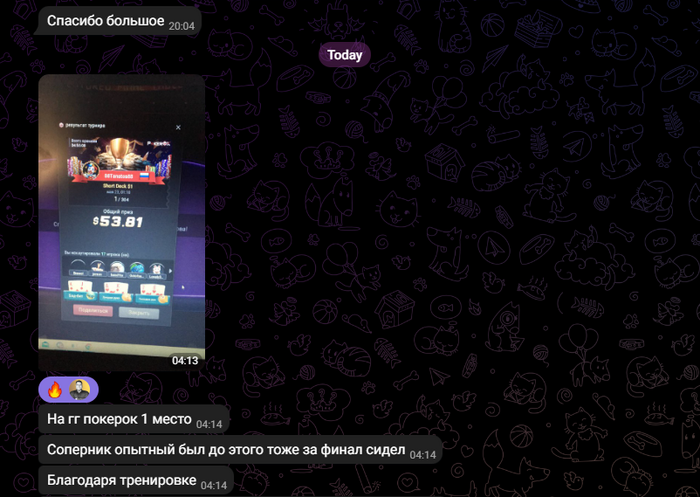 Прошли первые пять занятий с Иваном: мне кажется, результат от "знание названий позиций" до "три финальных стола" за 30 турниров говорит о многом. Спасибо большое ему, крайне доходчиво объясняет и отвечает на все интересующие вопросы.