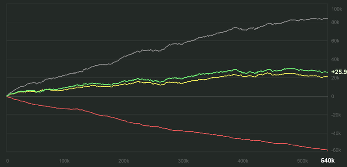 Играет только 100+ , берет топ места в дорогом лидерборде, в общем можно назвать топ игроком, хотя график с ним это пиздец. Но опять же против него я уже брал кешауты, поэтому реальная картина отличается. С ним переключил график в $ а не в бб