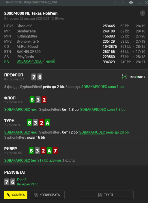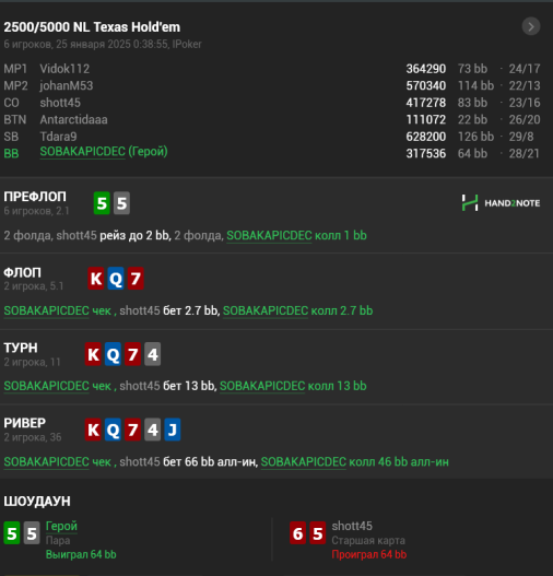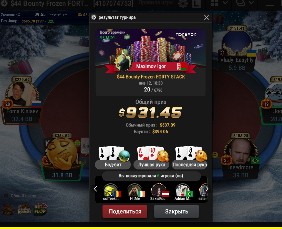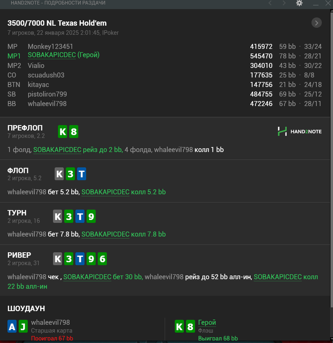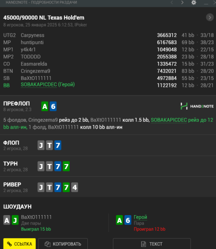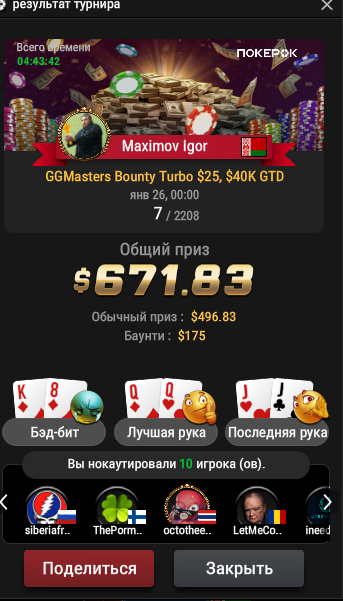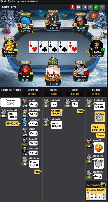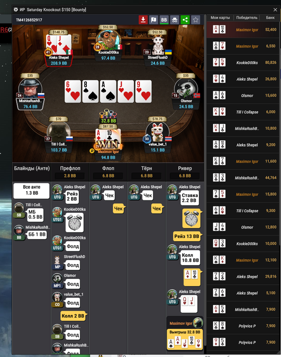 Мне сегодня отъезд в топ двадцать приснился, я почему то заколил 77 против чипака со в BB 30 бб вместо пуша, и про колил в 3 доску, 8 K 2 A Q, посмотрев на 87о))
