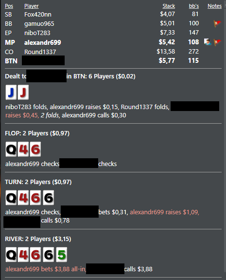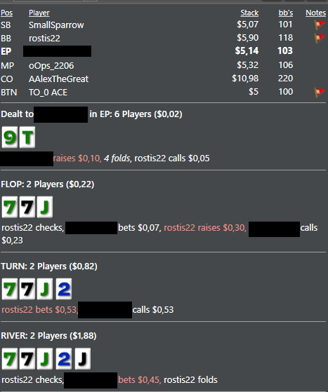 Раздача похожая на ту что недавно выкладывала. Кажется что люди просто начинают агрится без причины, когда играешь чек флоп, а потом ставишь 1/3 на терне.