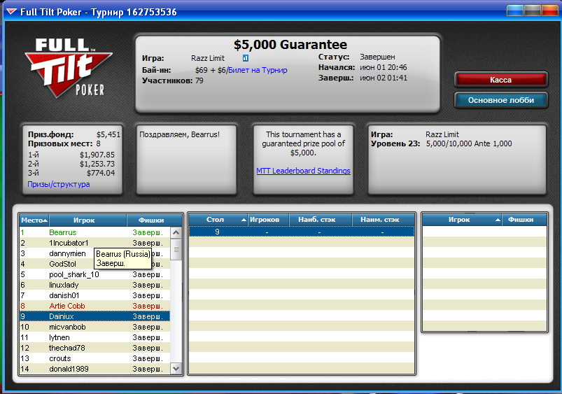 Пожалуй, тоже поделюсь радостью )) В команду Винтим не прошел, так что играю на свои. Турнир только закончился. Состав на финальном столе был слабый ужасно, все все в страхе сбрасывали а я все забирал )).