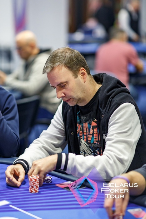 После этой раздачи у Фурсова осталось около 10бб. В последней раздаче перед перерывом Алексей запушил блайнд в блайнд , Максим Оськин отбил с .