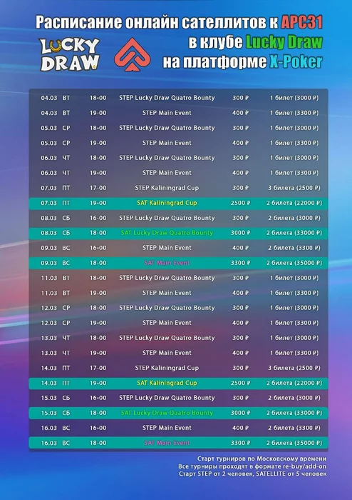 - 16:00 МСК (15:00 по Калининграду) степ по 300р. к финальному сателлиту Lucky Draw Quatro Bounty.