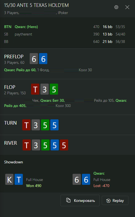 Femenist, ага, тут всё очевидно. Посмотрел все средние/крупные раздачи с шоудауном ривера - уверен на 100%, что это не очень умный оператор с ботом, который тупо тыкает то, что ему на экране показывается, даже против фишей. Местами абсолютно абсурдные сайзы блайнд в блайнд по Визарду по типу гигантского почти 2х овербета ривера. Пытается маскироваться тремя способами: