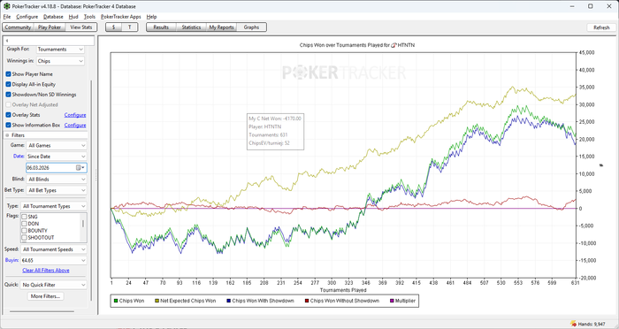Катал эти два дня пятерки, но уже чуть с меньшим фанатизмом. Продолжает стриковать по деньгам, по сути откатал в 0 пострб, даже в небольшой минус. На самом деле сейчас понимаю, что между 5 и 10 огромная разница по скиллу, здесь реги играют очень шаблонно и если ты видишь условный рейз на ривере - это с 95 - 97% вероятностью вэлью (понимал это и раньше, но на контрасте с десятками особенно заметно). Всего отыграл 631 спин и результат по ев прям порадовал: