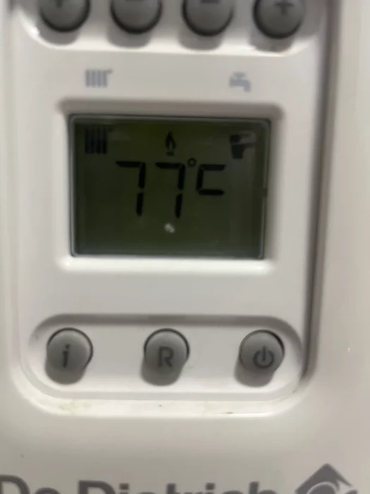 Котел гудит ненапряжно. Он у меня работает по датчику наружной температуры, поэтому сейчас у него рабочая температура - 77 градусов. Запас есть и по температуре (максимальная, кажется, 85. Ну или 90) и по мощности, тк он гоняет воду пока еще вполсилы.