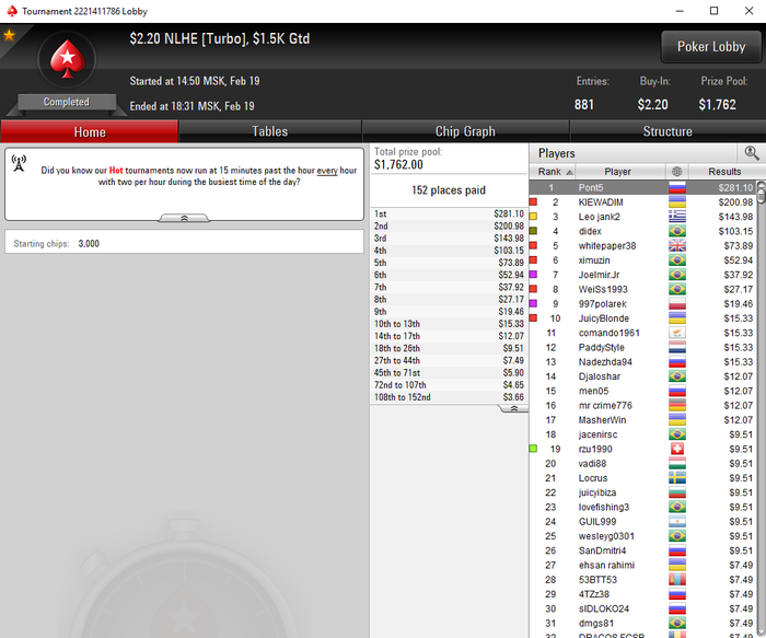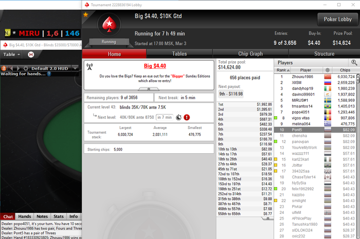 Да нового ничего. Спины катаю понемногу и решил тут рум попробовать другой. Сначала Redstar poker испытал. Что то не вставило. немножко поднял там и вывел. Сейчас еще куда нить подамся, где в мтт народу поменьше. Как то так. Ну сейчас еще пару сателлитов на юбилейный миллион сыграю, без лудомании то никуда