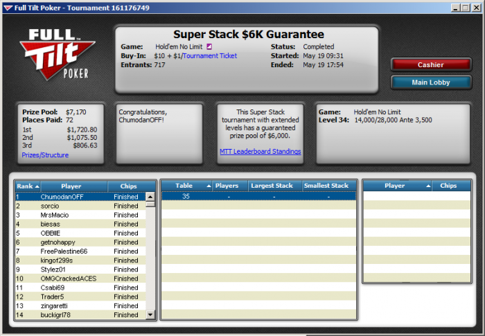 AbsolutePoker - отыграл 110 турниров со средним бай-ином $7, прибыль составила $2098: