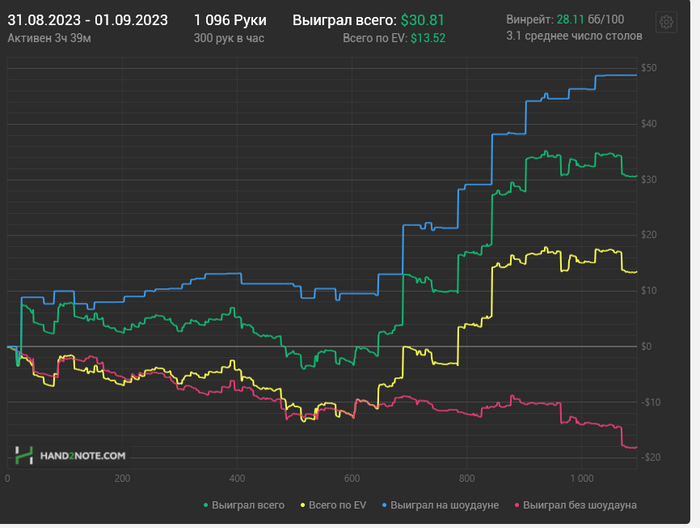 MaDzzz, сеть чико, рум тайгергейминг. Да, там криво рейк считает. У меня наоборот мало рейка показывает) плюс раздачи со страховкой трекаются через жопу. Но по кассе примерно как на графике) +105