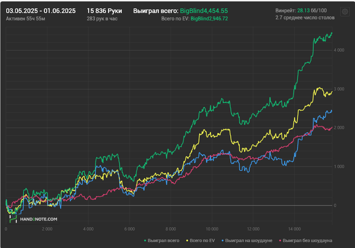 4. Для себя понял, что для меня оптимально играть 4 стола - за счет ХУ или 3 максов, набирается более менее стабильное кол-во рук в час + сильно растет ЕВ как раз против слабых регов и каких-то спецефических фишей, потому что есть время подумать\изучить и выбрать линию с максимальным ЕВ (как мне кажется)