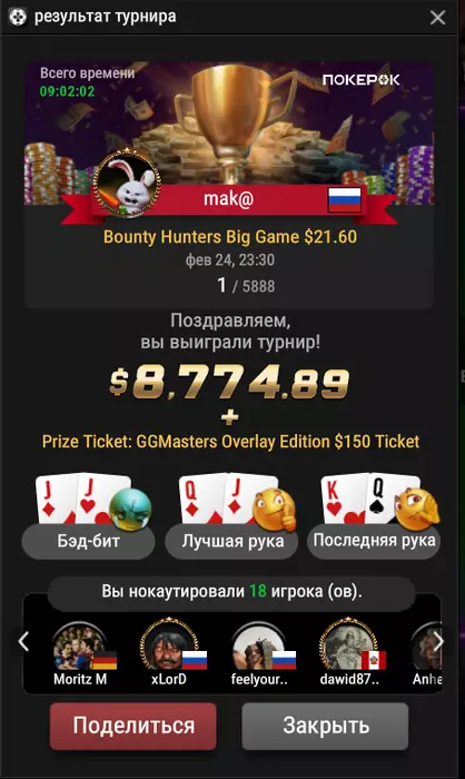 Макс yurovskikh и Костя Konstant1N88 обошли поле в 5888 оппонентов BH Big Game $21.60.