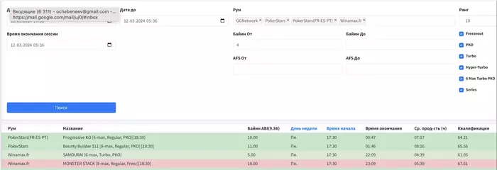 Например, можно задать временные рамки сессии и отсеять в середине загрузки долгие турниры, чтобы не домучивать 1-2 таких турнира, когда остальные закончились. Или отключить “плохие” форматы: фулл ринг турбины и турбины 6-8 макс без нокаута.