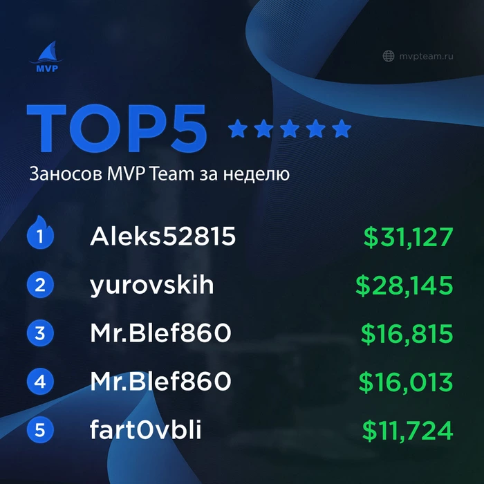 🔘 Более 40 игроков MVP TEAM за неделю выиграли в одном турнире от $1K и более.