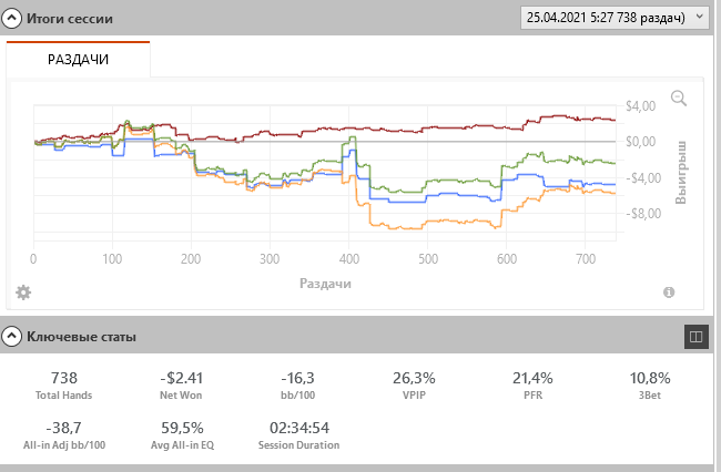 Есть у меня ошибки, без них не получается. Вчера и сегодня были 2 раздачи одинаковые: у меня сет с флопа, опп - фиш все коллит, на ривере ему страйт 3-8 закрывается, я этого не замечаю и колю all-in - "стек, прощай". Буду ближе к вечеру разбирать сессию, посмотрю - может я не настолько и не прав, но в любом случае, местами я невнимателен - это минус в нашей работе.