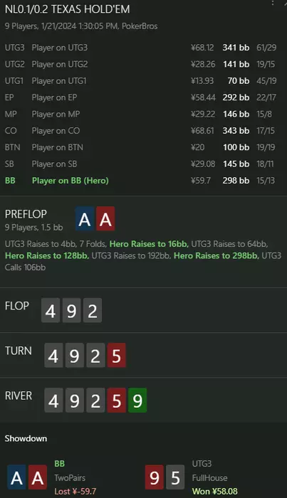 В первый день нового года, пока большая часть населения великой и необьятной по традиции откисала с дичайшего бодуна, доедая салаты, я снова привыкал к вертикальным столам на Pokerbros и к отсутствию тайм-банков. В подобных условиях реализовывать эквити и полумифическое преимущество в скилле в три улицы, да и еще и в глубине 100-200бб после сплошного пуш-фолда в спинах на покерке было сложно. Но уже через несколько сессий я как ни в чем не бывало несся навстречу мечте на скорости 300+раздач в час. Раздавали неплохо, оппоненты на нл10 не доставляли серьезных проблем. Бодро стартанул, одним словом.