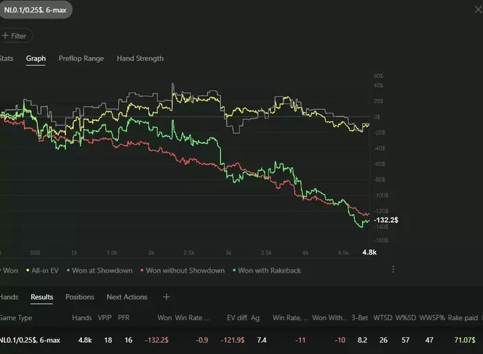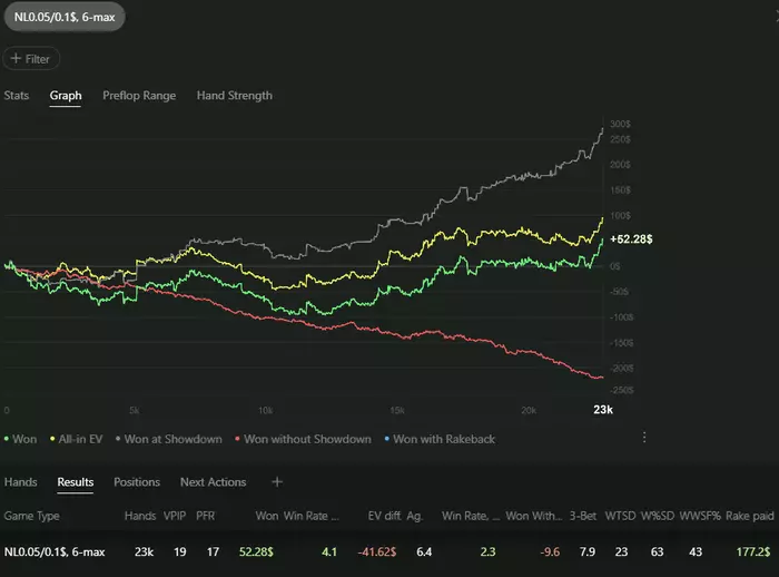 Да, в плюс - уже хорошо, однако я ожидал большего и от такой удручающей картины и от осознания того, что я плачу просто блядскую гору комиссии c каждой раздачи, получая взамен в виде РБ "околонихуя", меня просто переклинило....и я решил, что до заветной цифры в $300 я дойду....играя спины 6мах!