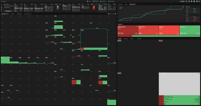 Падает 7ка, которая наш диап никак не усилила. Какие-то крайне редкие стрэйты по 65о, которые почти всегда фолдят на тёрне, и 96c закрылись. Даже если опп очень сильно переблефует тёрн, наша подстройка агрессивнее реагировать на ставку тёрна, если же тёрн сыграли пассивно, то увеличить донк с блефами в наши ранауты. Ещё можно выйти за ренджи и сделать такой мув, если мы ожидаем что опп нит и сфолдит всё, что не ТП+. Но это точно не про Prodigy. Не имеет никакого смысла создавать диапазон донк АИ по такой карте ривера.