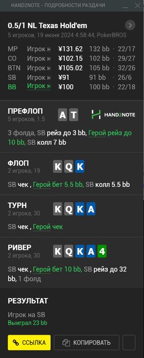 Короче, засчитываю -85бб, ибо блеф ненужный, так еще и в сильный диап.