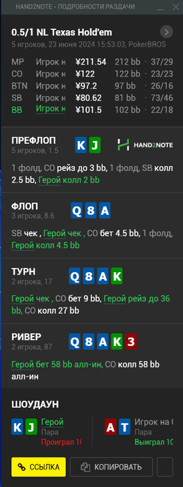 2) Во время катки по статам посмотрел, что он таким донком играл ТП слабый кикер, надо было либо рейзить сразу, либо ставить в чек на терне, но вот колл ривера сейчас вижу плохим, доехало много чего, а в моменте даже не подумал толком, хотя сказал "Ну че там в 109 доехал?". -15бб