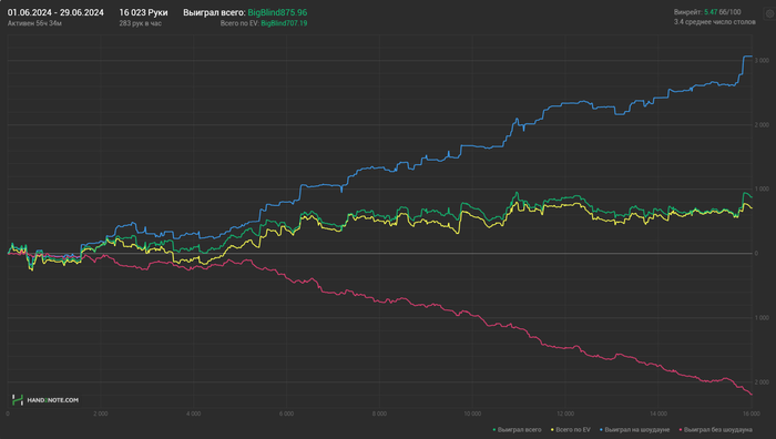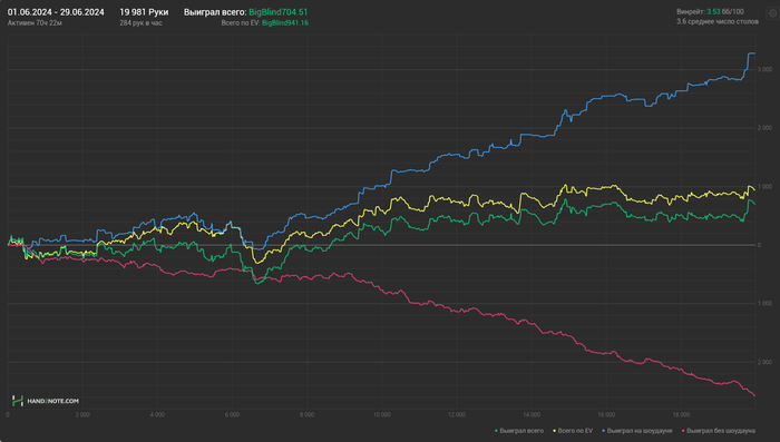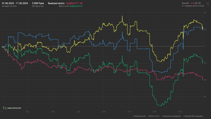 В этом месяце я случайно сломал себе режим, и в итоге так он и прошел. Рандомные выходные, 1-2 ч катки в день. Плюсом ко всему в одном приложении в первую неделю застопорилась игра из-за блокировок, по итогу закрыли доступ в двух клубах, а само приложение заблокировало мне доступ с девайса. До сих пор пока висят там средства. У владельцев клуба позиция, что аффилейт привел ботов. Ну да, конечно я бот, раз у меня винрейт в одном клубе был 21бб/100, во втором без статистики, но, думаю - не меньше. Цирк. Процесс разрешения идет медленно, но надеюсь, что все разрешится.